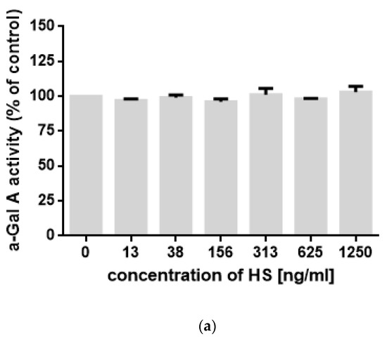 Some hypotheses have been proposed, but evidence to support these hypotheses remains to be established. The first hypothesis is based on the observation that accumulating GAGs can directly inhibit the activity of a variety of lysosomal enzymes [13,14] or cause some other critical disruption of the internal environment of late endosomes and lysosomes (pH change, lack of saposin-substrate interaction, etc.) leading to reduced degradation of additional substrates [15]. In our work, we have measured the activity of α-galactosidase A (α-Gal A) in vitro in the presence of different concentrations of HS and have not found changes in enzyme activity (Figure 4). Nevertheless, this does not exclude the effect of GAGs on the enzyme activity directly in the lysosomes. Additionally, we cannot exclude that HS may influence the expression of α-Gal A gene and other lysosomal enzymes genes. For further study, a series of experiments on cell cultures are planned.