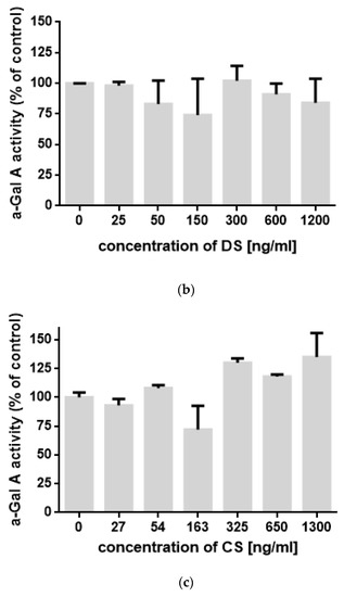 The activity of α-Gal A in the presence of different concentrations of (a) heparan sulfate (HS), (b) dermatan sulfate (DS), and (c) CS. Presented results are mean values from three independent experiments, with SD indicated as error bars. No statistically significant differences (at p < 0.05) were detected between control experiments (no GAGs added) and any measurements in the presence of GAGs.