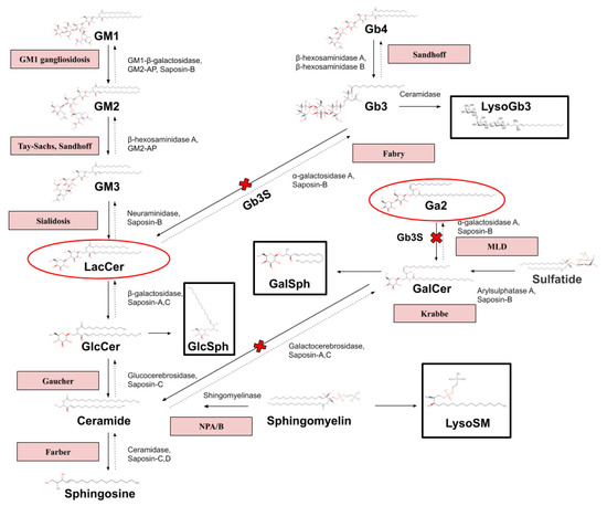 The diseases are indicated in the red boxes. Lysosphingolipids (LysoSLs) are indicated in the black boxes. The red ovals contain structural isomers. Gb4—globotetraosylceramide; Gb3—globotriaosylceramide; LysoGb3—globotriaosylsphingosine; Ga2—galabiosylceramide; GalCer—galactosylceramide; GalCer—galactosylceramide; GalSph—galactosylsphingosine; LysoSM—lysosphingomyelin; GlcCer—glucosylceramide; LacCer—lactosylceramide; GM1, GM2, GM3—gangliosides; and GlcSph—glucosylsphingosine.