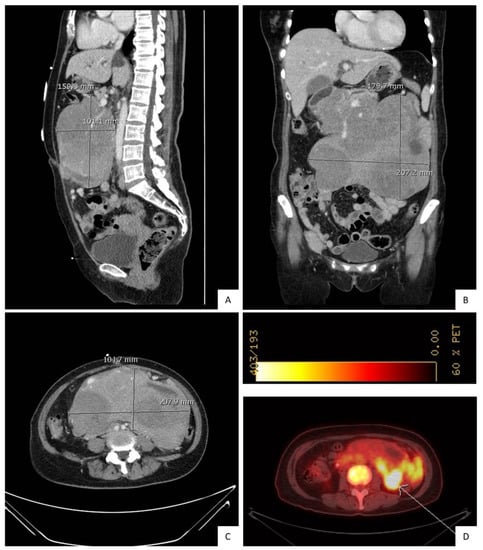 Initial abdominal and pelvic CT with contrast, prior to treatment. (A). sagittal, (B). coronal, and (C). transverse planes show a large lobulated heterogeneous mass involving the head of the pancreas and retroperitoneum. It measures approximately 19 x 22 cm (craniocaudal x transverse). (D). PET-FDG study demonstrates peripancreatic heterogeneous FDG-avid mesenteric mass (SUV 6.0).
