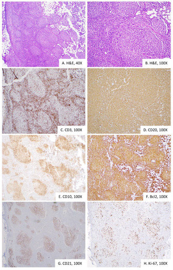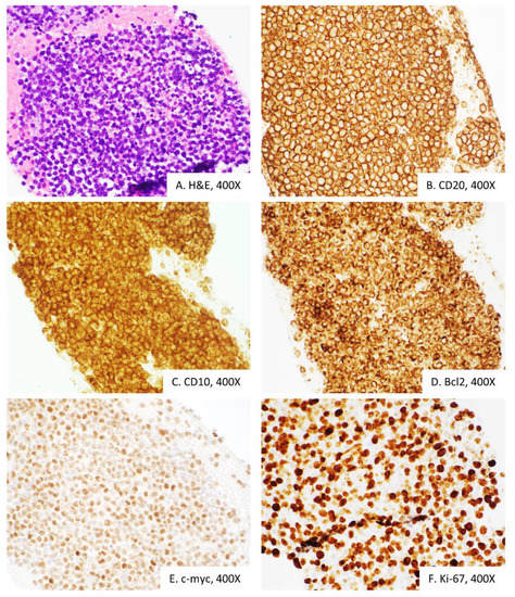 - Bischin, A.M.; Dorer, R.; Aboulafia, D. Transformation of Follicular Lymphoma to a High-Grade B-Cell Lymphoma with MYC and BCL2 Translocations and Overlapping Features of Burkitt Lymphoma and Acute Lymphoblastic Leukemia: A Case Report and Literature Review. Clin. Med. Insights Blood Disord. 2017, 10. [Google Scholar] [CrossRef]