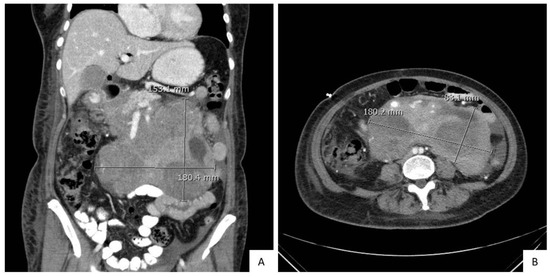 Comparison of abdominal and pelvic CT with contrast, post treatment. (A). Coronal, and (B). transverse planes show large lobulated and heterogeneously enhancing mass involving the head of the pancreas and retroperitoneum. Mass is decreased to 17 × 19 cm versus 19 × 22 cm (Figure 1A–C) after the initiation of treatment.
