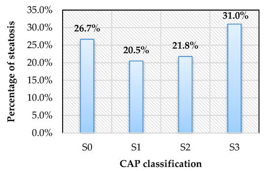 Hepatic steatosis on FibroScan with controlled attenuation parameter (CAP). S0, CAP ≤ 233 dB/m; S1, CAP 234–269 dB/m; S2, CAP 270–300 dB/m; S3, CAP ≥ 301 dB/m.