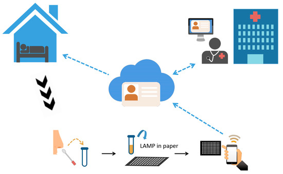 Schematic of the point-of-care (POC) RNA-based novel coronavirus disease (COVID-19) diagnostic device. In this figure, the conceptual workflow of integrating both point-of-care diagnostic and loop-mediated isothermal amplification (LAMP) assay with mobile device was presented. People at home quarantine can collect their infectious specimen through nasal swab; after adding specific reagents for LAMP reaction, the colorimetric result can be observed on paper. By recording the colorimetric change through a mobile phone camera, the user could upload the result to cloud storage by Internet. Clinicians or health-care specialist could thus analyze the result and offer immediate information for both patient and the government. Since the whole diagnostic process can be performed at home, the suspected case does not need to travel to hospital and can in turns lower the risk of spreading the disease.