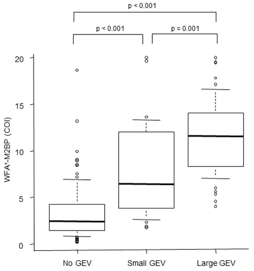 3.2. Serum WFA+–M2BP Levels and the Presence or Grade of GEV