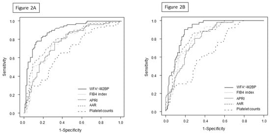 Receiver operating characteristic curves of WFA+–M2BP and other serum fibrosis markers. Various serum markers of fibrosis were compared to ensure the diagnostic accuracy of the presence of GEV (A) and the presence of large GEV (B).
