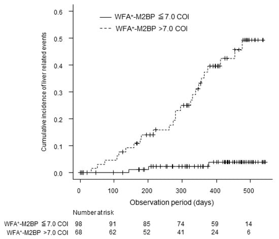 Cumulative incidence of liver related events. Patients were categorized into two groups with the cut-off value for WFA+–M2BP.