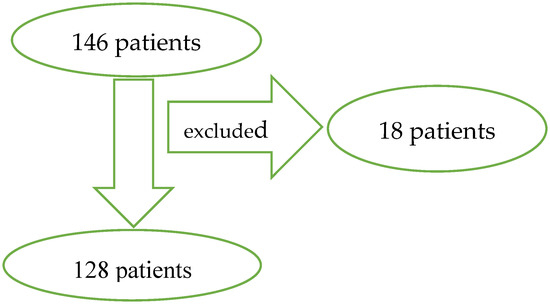 The study included a group of 128 patients with isolated craniocerebral injuries. The study obtained the consent of the Bioethics Commission located at Medical University in Lublin. Number of consent KE-0254/313/2016. Twenty eight patients were operated upon due to epidural hematoma (EDH) and 100 were operated upon due to acute subdural hematoma (SDH). All the patients were operated upon and treated in the Department of Neurosurgery from 1 October 2014 to 31 August 2017. During this period, 146 patients were treated surgically for extra-axial hematoma, whereas 18 patients were excluded from the study. Exclusion criteria for the examined group of patients included: the lack of complete medical documentation, incomplete laboratory tests, the lack of description of the computed tomography of the head, the lack of contact with the patient or his family after 6 months, and the occurrence of injuries other than head injury occurring in whole body computer tomography requiring treatment (Figure 1).