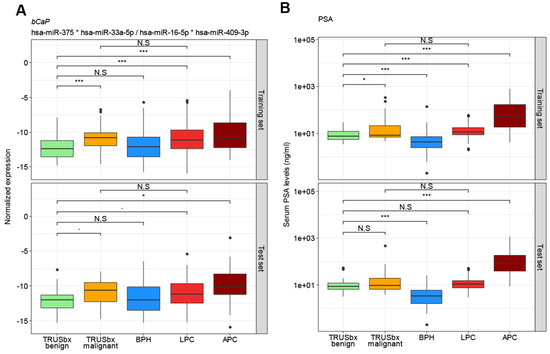 Box plot analysis for the four-miRNA diagnostic model bCaP (miR-375*miR-33a-5p/miR-16-5p*miR-409-3p) (A) and PSA (B) in the training (top) or test (bottom) sets. Boxes represent the first and third quartiles. The median is shown as a horizontal line and dots indicate outliers. p values indicate the difference in median, by Wilcoxon rank sum test. N.S = not significant (p > 0.05), ∙ = p < 0.1; * = p < 0.05; *** = p < 0.001; BPH (blue): benign prostatic hyperplasia; LPC (red): localized prostate cancer; APC (dark red: advanced prostate cancer; TRUSbx (green and orange: transrectal ultrasound (TRUS) guided biopsy; PSA: prostate specific antigen.