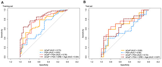 Ratio models, such as bCaP, are attractive, as they require no additional normalization by design. Potentially, this may ease future implementation into clinical use as it requires only a simple and straightforward laboratory setup (real-time PCR). When bCaP was combined with PSA, DRE, and age, the resulting model had increased accuracy over PSA alone (Figure 2) in both the training and test sets. Therefore, our results suggest that bCaP could be used in combination with existing clinical parameters to select which patients should undergo TRUSbx, although further large-scale clinical testing is required.