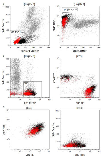 Gating strategy for the characteristic aberrant T-cell population. (A) Forward scatter versus side scatter gating identifies small aberrant cells indicated in red (left) with low CD45 expression (right). (B) The aberrant T-cells are CD3-positive (left). Plotting of CD4 versus CD8 highlights the lower expression of CD8 in these aberrant T-cells (right). (C) Diminished CD2 and CD5 marker expression on the small aberrant T-cell fraction (left); side scatter versus CD7 plotting demonstrates lack of/weak expression of CD7 (right).