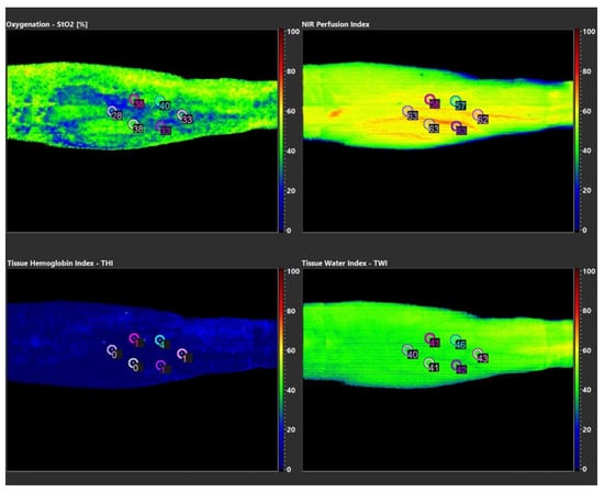 StO2 measurements revealed intra- and interindividual differences up to 30%, depending on the point of interest (POI) examined. Index values measured for NIR and TWI showed intraindividual swings up to 13 index points and interindividual differences up to 19 index points (Table 2, Table 3, Table 4, Table 5 and Table 6). HSI parameters exemplary of a single measurement of proband 01 are shown in Figure 1. Microcirculatory parameters showed no causal relation to the plasma-treated areas, but seemed to follow anatomical conditions and structures (e.g., superficial skin veins). In summary, no relevant differences or pathologies between CA- treated and non-CAP-treated areas could be diagnosed with regard to analyzed microperfusion parameters.