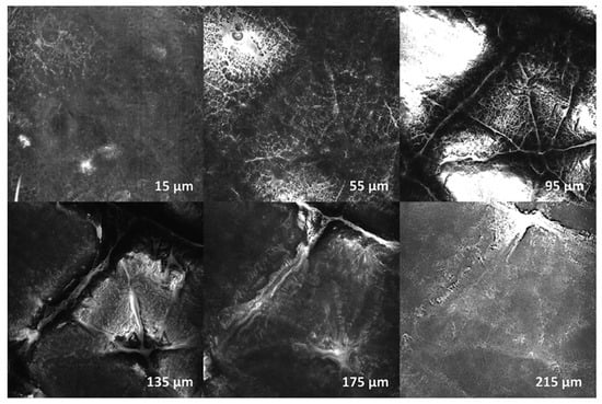 Confocal laser scanning microscopy (CLSM) examination of proband 01—exemplary shown for Lesion_02 (3 × 10 s CAP). Depth: 15, 55, 95, 135, 175, 215 µm. There were no signs of disturbed cell architecture or morphology in the sense of a cancerous or precancerous lesion, or any other pathological changes.
