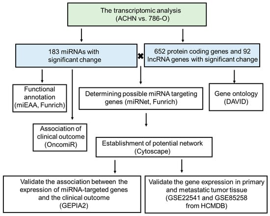 Flowchart of this study. The RNA of 786-O and ACHN cells were extracted and then subjected to RNA and small RNA sequencing. The differentially expressed 183 miRNA genes, 652 protein coding genes, and 92 lncRNA genes were identified. The functional annotation were performed via miRNet, Funrich, and DAVID. The possible miRNA targeting genes were predicted by miRNet and Funrich. The association of gene expression and survival rate was evaluated by OncomiR and GEPIA2. The expression in primary and metastatic tumor tissue via GEO datasets (the fold change and statistical analysis of GSE22541 and GSE85258 was adapted from HCMDB).