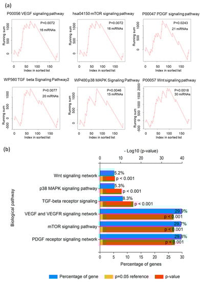 Identified statistically significantly enriched pathways, via (a) miEAA website (miRNA enrichment analysis, pathways (miRWalk); and (b) Funrich software (biological pathways).