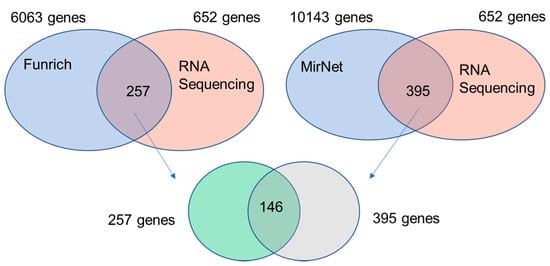 Venn diagram analysis indicating the identification of shared miRNAs-targeted protein-coding genes. Blue arrows indicate the 257 genes and 395 genes in the lower panel were from the intersected genes between Funrich and RNA sequencing, and miRNet and RNA sequencing respectively.
