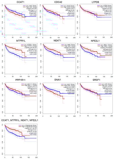 To further validate whether the miRNA-targeted genes were associated with relapse-free survival in patients with kidney cancers, it was evaluated via the GEPIA2 database (Figure 4). Nine genes, including long non-coding RNA Nuclear Paraspeckle Assembly Transcript 1 (NEAT1) and Colon Cancer Associated Transcript 1 (CCAT1), protein coding genes Cell Division Cycle 42 (CDC42), Protein Phosphatase 1 Regulatory Inhibitor Subunit 11 (PPP1R11), Nuclear Factor, Erythroid 2 Like 1 (NFE2L1), Mitochondrial Fission Regulator 1 Like (MTFR1L), LY6/PLAUR Domain Containing 6 (LYPD6), Serine And Arginine Rich Splicing Factor 1 (SRSF1), and Snail Family Transcriptional Repressor 1 (SNAI1) were evaluated. In Figure 5, the trend toward improved disease-free survival was observed in patients with kidney cancer with a higher expression of CCAT1, NEAT1, MTFRL1, and NFE2L1. The opposite pattern of disease-free survival was shown in SNAI1. The Kaplan–Meier curve was also performed according to the expression of a four gene signature.