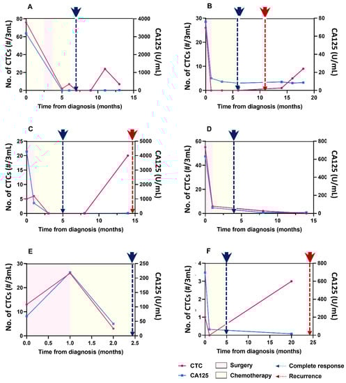 | No. | Age at Diagnosis (years) | Initial FIGO Stage | Histology | Initial CA125 (U/mL) | Initial CTCs (/3 mL) | Treatment Response | CA125 after Therapy (U/mL) | CTCs after Therapy (/3 mL) | No. of Blood Samples |