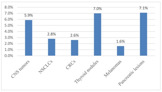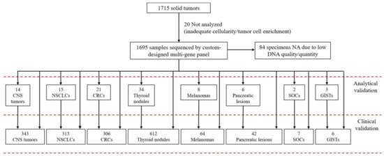 Specimens included primary or metastatic lesions: 343 CNS/intracranial tumors, 315 NSCLCs, 306 CRCs, 612 thyroid nodules (pre-operative material), 64 melanomas, 42 pancreatic lesions (pre-operative material), 7 SOCs, and 6 GISTs (Figure 1).