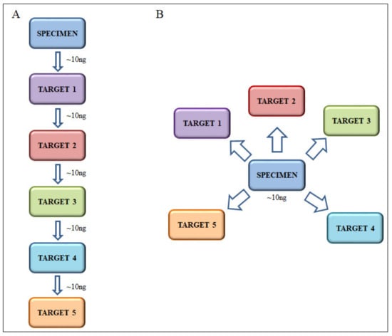 Schemes of molecular analysis using “sequential” (A) or “parallel” (B) approaches.