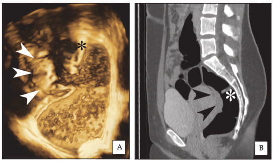 - Ferrero, S.; Biscaldi, E.; Morotti, M.; Venturini, P.L.; Remorgida, V.; Rollandi, G.A.; Valenzano Menada, M. Multidetector computerized tomography enteroclysis vs. rectal water contrast transvaginal ultrasonography in determining the presence and extent of bowel endometriosis. Ultrasound. Obstet. Gynecol. 2011, 37, 603–613. [Google Scholar] [CrossRef]