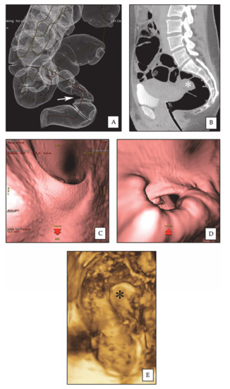 - Roman, H.; Carilho, J.; Da Costa, C.; De Vecchi, C.; Suaud, O.; Monroc, M.; Hochain, P.; Vassilieff, M.; Savoye-Collet, C.; Saint-Ghislain, M. Computed tomography-based virtual colonoscopy in the assessment of bowel endometriosis: The surgeon’s point of view. Gynecol. Obs. Fertil. 2016, 44, 3–10. [Google Scholar] [CrossRef]