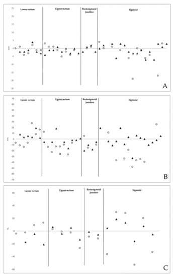 (A) Difference (mm) between imaging methods and surgery in estimating the largest diameter of endometriotic rectosigmoid nodules; (B) difference (mm) between imaging methods and surgery in estimating the distance from the lowest endometriotic rectosigmoid nodule and the anal verge; (C) Difference (%) between imaging methods and surgery in estimating the stenosis of bowel lumen due to the endometriotic nodules (calculated in patients undergoing colorectal segmental resection). White circles: 3D-RWC-TVS; black triangles: CTC