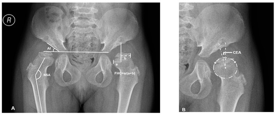 - Li, L.Y.; Zhang, L.J.; Li, Q.W.; Zhao, Q.; Jia, J.Y.; Huang, T. Development of the osseous and cartilaginous acetabular index in normal children and those with developmental dysplasia of the hip: A cross-sectional study using MRI. J. Bone Jt. Surg. Br. 2012, 94, 1625–1631. [Google Scholar] [CrossRef]