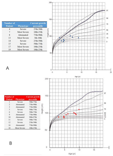 Growth charts of males and females with mucopolysaccharidosis IVA and study participants. (A) The blue ‘◆’ shows male participants; (B) the red ‘▲’ shows female participants; Note: the dotted and blue lines show the 50th percentile values for normal males and females; revised from Montaño et al. [26]. The phenotype is defined by the present height; less than 25th percentile (the most severe), the 25th–75th percentile (severe), over 75th percentile (attenuated).