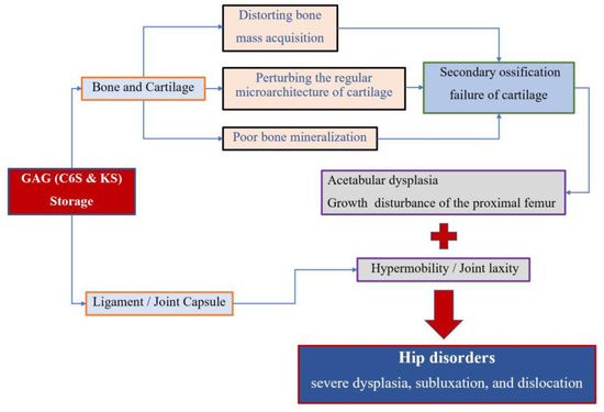 Accumulation of the glycosaminoglycans (GAGs) (C6S and KS) leads to the degeneration of the cartilage matrix and its connective tissue, perturbing the regular microarchitecture of cartilage and successively distorting bone ossification and growth. MPS IVA patients present impaired cartilage quality because of distortion of geometric shape, collagen disposition in the extracellular matrix (ECM), and remodeling, resulting in reduced bone mineralization [4,27]. Secondary ossification centers of hips are disordered in development, which leads to growth disturbance of the proximal femur and acetabular dysplasia. On the other hand, GAG accumulation in the ligament and capsule of the hips results in hypermobility and joint laxity, which aggravates the instability of hips. All these factors contribute to the molecular pathophysiology of hip disorders for MPS IVA patients (Figure 5).
