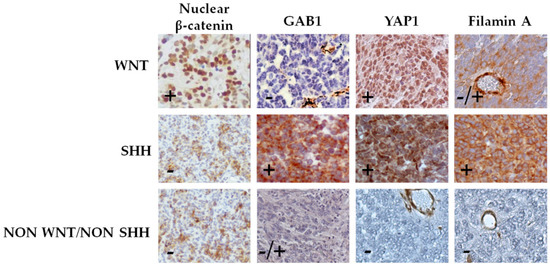β-Catenin was scored as positive when ≥10% of neoplastic nuclei where stained, regardless of cytoplasmic immunoreactivity. GAB1, YAP1, and filamin A were scored as positive when ≥20% of neoplastic cells showed staining intensity >1. Granular nuclear reactivity was considered as negative. Samples were assigned to the WNT molecular subgroup when β-catenin nuclear translocation or mutation in CTNNB1 exon 3 were present; GAB1, YAP1, and filamin A triple positivity identified the SHH molecular subgroup; negativity for all the previous biomarkers account for molecular subgroup non-WNT and non-SHH.