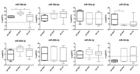 In the AD non-WNT/non-SHH subgroup, only the upregulated miR-196b-5p reached the significance threshold (p < 0.05) as compared with the whole CH group (Figure 4). Comparing AD non-WNT/non-SHH with CH non-WNT/non-SHH cases, miR-196b-5p resulted significantly upregulated (p < 0.05).