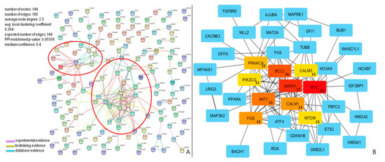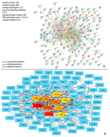 Unraveling the protein–protein interaction (PPI) of miRNA targets is essential to elucidate molecular mechanisms. The PPI network was evaluated by STRING v10.5 (http://string.-db.org) [55]. A confidence score >0.4, was set as the cut-off criterion. Each network node represents a specific miRNA target, and the edges represent the predicted functional associations. To investigate the functional associations, we selected the following active interaction sources: “text mining” (a function showing a list of significant protein interaction groups, extracted from the abstracts of scientific literature); “databases” (a feature showing a list of significant protein interaction groups, gathered from curated databases); and “experiment” (a function showing a list of significant protein interaction datasets, gathered from other protein–protein interaction databases).