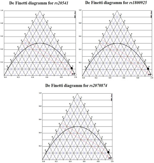SNPs included in the study accomplished HWE, although rs1800874 has a slight variation in the proportion of heterozygous (p = 0.06, Table 3). De Finetti plots were used to demonstrate HWE (Figure 1). The MAF in all SNPs was similar to previously reported in international databases.