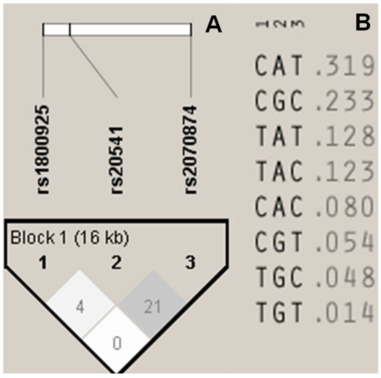 Since the three SNPs were localized in the same chromosome, LD and HB were calculated. No significant LD or HB was found in any possible combination for the SNPs (Figure 2A). We include the frequencies for all the possible permutation with all the SNPs (Figure 2B).