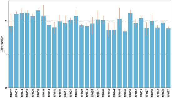 CNV signal analysis by copycaller®. The fluorescence signal of each sample is used to calculate the copy number. All of the samples have the common variable (one copy by chromosome). Showing an extract of thirty samples in a bar graph.