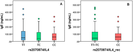 IgE levels were measured in the AP group as part of the clinical protocol, so we decided to stratify by the genotypes of rs20541/IL4. For this analysis, full-genotype and recessive models were applied. No statistical differences were found for any analyzed model (full-genotype, p = 0.89; recessive, p = 0.68) (Figure 5).