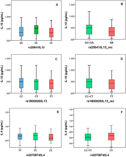 IL-4 and IL-13 levels stratified by genotypes. The full-genotype (A,C,E), recessive (B,D), and overdominant (F) models were applied based on distribution data. No significant differences were identified.