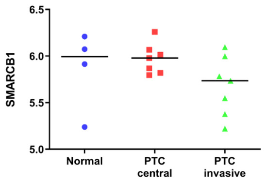 SMARCB1 gene expression levels from a published dataset (GSE6004) in normal thyroid tissues, tumor centers of papillary thyroid cancer (PTC), and invasive areas of PTC. Data are reported as scatter plots of log2 values and medians.