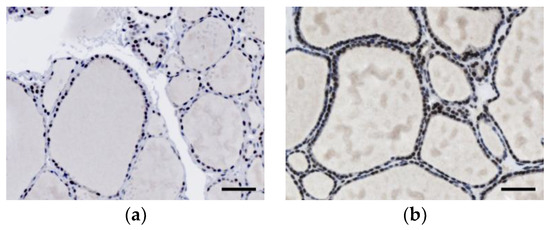 This study (12MMHIS149; valid from 14 December 2012 to 13 December 2021) was approved and monitored by the Institutional Review Board of MacKay Memorial Hospital. Patients who underwent thyroidectomy for benign or malignant thyroid disease were de-identified and randomly selected [7]. Sections of formalin-fixed and paraffin-embedded tissue samples from pathology department archives were subjected to immunohistochemical staining.
