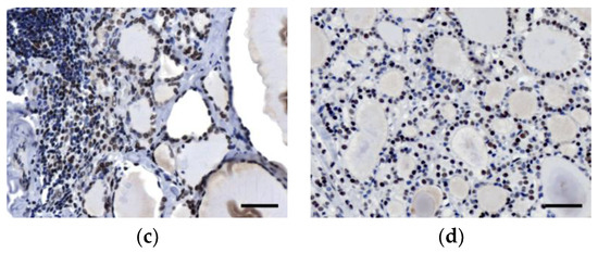 Immunohistochemical expression of integrase interactor 1 (INI1) in (a) normal thyroid tissue, (b) nodular goiter, (c) lymphocytic thyroiditis, and (d) follicular adenoma. Scale bars: 50 μm.
