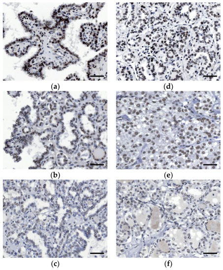 Immunohistochemical expression of integrase interactor 1 (INI1) in (a–c) papillary thyroid cancer and (d–f) follicular thyroid cancer. Representative microphotographs of (a,d) strong, (b,e) moderate, and (c,f) weak nuclear expression are shown. Scale bars: 50 μm.