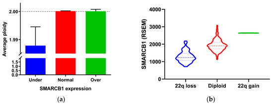Interestingly, we noted that tumors with SMARCB1 underexpression had a significantly lower ploidy (Figure 4a). The SMARCB1 gene maps to the long arm of chromosome 22 at position 11.23 (22q11.23). It is worth noting that the most common somatic copy number alteration in papillary thyroid cancer is characterized as chromosome 22q loss [18]. In our analysis, the majority (89%) of cases with SMARCB1 underexpression had chromosome 22q loss. We further explored the relationship between the SMARCB1 expression level and copy number alterations of chromosome 22q. As expected, chromosome 22q loss was significantly associated with a lower expression level of SMARCB1 (Figure 4b).