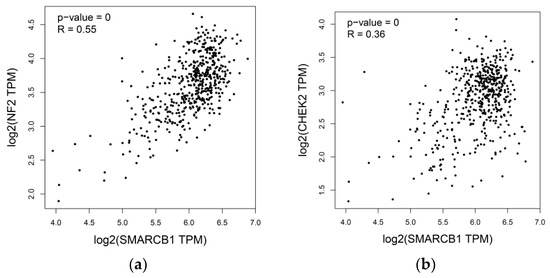 Associations of SMARCB1 expression levels and the expression of (a) NF2 and (b) CHEK2 in papillary thyroid cancer (THCA) dataset from The Cancer Genome Atlas (TCGA). These three genes are all located on chromosome 22q. TPM: transcripts per million.