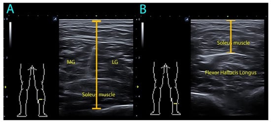 Ultrasound assessment of soleus muscle depth in the (A) mid-third and (B) distal-third of the calf. MG: medial gastrocnemius; LG: lateral gastrocnemius.