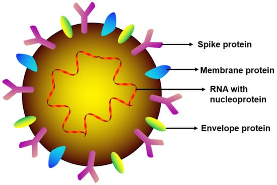 According to the cryogenic electron microscopy (TEM) images, the SARS-CoV-2 virion is crown-shaped with a diameter of ~50–200 nm [], having four structural proteins: spike (S), envelope (E), membrane (M), and nucleocapsid (N) (illustrated in Figure 1). The S, E, and M proteins are responsible for viral envelope generation and the N protein carries the RNA genome (~30 kb). Of note, the spike protein is the glycoprotein that facilitates SARS-CoV-2 attachment, fusion, entry, and transmission into host cells by binding with human angiotensin converting enzyme 2 (hACE2) receptors [], which are expressed by epithelial cells of the lung, intestine, kidney, blood vessels, and oral mucosa []. The detailed mechanism of how SARS-CoV-2 S protein binds with hACEs, and ultimately leads to pathological organ damage, remains unknown and requires further investigation.