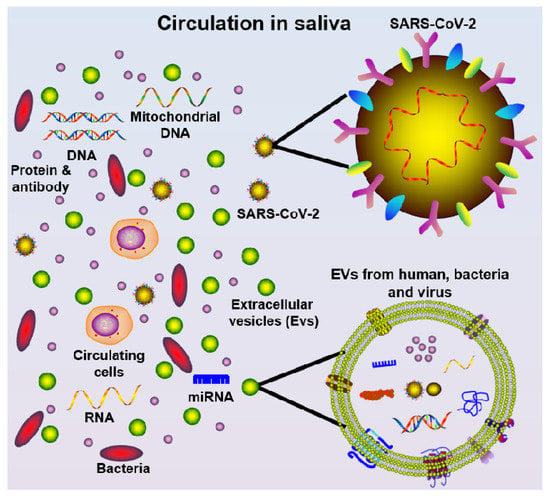 Schematic diagram of saliva components, including cells, mitochondrial DNA, DNA, protein/antibody, bacteria, miRNA, extracellular vesicles (EVs, from multiple oral cavity resident species), and SARS-CoV-2 virus.