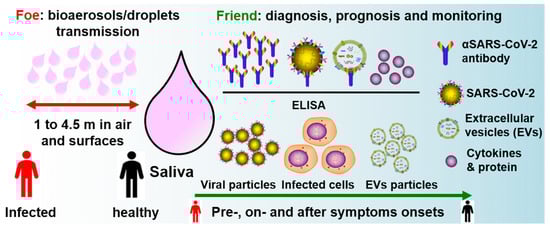 Saliva as a friend and foe in the fight against COVID-19. Saliva has a role in human-to-human transmission via bioaerosols and droplets. Salivary proteins and anti-SARS-CoV-2 antibodies, viral particles, EVs, and infected host cells can be potential diagnostic, prognostic, and COVID immunity monitoring biomarkers, for both symptomatic and asymptomatic patients. EVs: extracellular vesicles; ELISA: enzyme-linked immunosorbent assay.