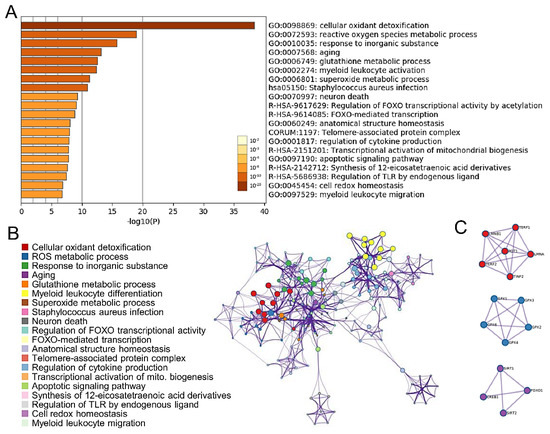 To investigate the biological significance of these overlapping genes, we uploaded the list of 96 upregulated genes into Metascape software for functional enrichment analysis. The Metascape analysis shows the top 20 clusters of enriched sets (Figure 1A). These genes were enriched in the molecular function categories telomere-associated protein complex, aging, and mitochondrion organization. To further capture the associations that exist between terms, a subset of rich terms was selected and presented as a network graph. Subsequently, we chose the term with the best p-value. Metascape was used to construct the protein-protein interaction (PPI) network of the 96 upregulated genes (Figure 1B). The network was visualized using Cytoscape, where each node represents a rich term and is first colored according to its cluster ID (Figure 1C).
