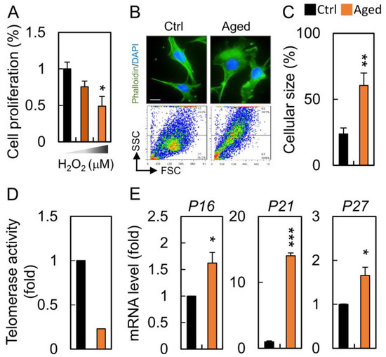 To ascertain the effect of hydrogen peroxide on cellular senescence, HGL5 cells were incubated with hydrogen peroxide. HGL5 cells were sensitive to increasing concentrations of H2O2 with an IC50 value of 100 μM at 24 h (Figure 2A). Senescent granulosa cells exhibited typical morphological changes characteristic of aged cells as they became flattened and enlarged when compared to those in the control groups (Figure 2B). We also observed that the senescent phenotype gradually developed with H2O2 treatment, which was confirmed by an increase in the cellular granularity, cell size and telomerase activity (Figure 2C,D). To further validate our model of cellular aging, we determined that mRNA expression for the senescence biomarkers, P16, P21 and P27, was significantly increased during cell senescence (Figure 2E).